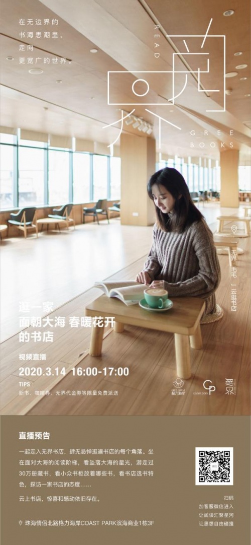 无界书店位于珠海市唐家湾格力海岸COAST PARK,占地面积 2560平方米,拥有超大的阅读空间,是珠海一家面朝大海的书店,被当地人誉为“城市文化客厅”。