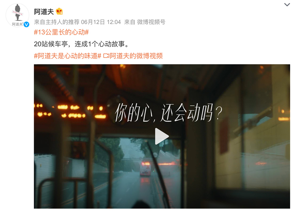 踏上这条浪漫之路,随着公交车行进,故事一站又一站地自动展开,乘客仿佛在追更一篇爱情小说。13公里长的心动,不仅是一次前所未有的营销创新,更是品牌在践行社会责任方面的创新尝试。阿道夫总裁李志珍女士在接受采访时表示:“阿道夫想通过给大家讲述一个纯真和有爱的故事,去唤醒每个人内心的心动。”