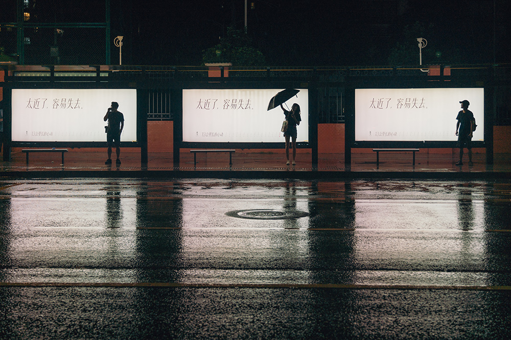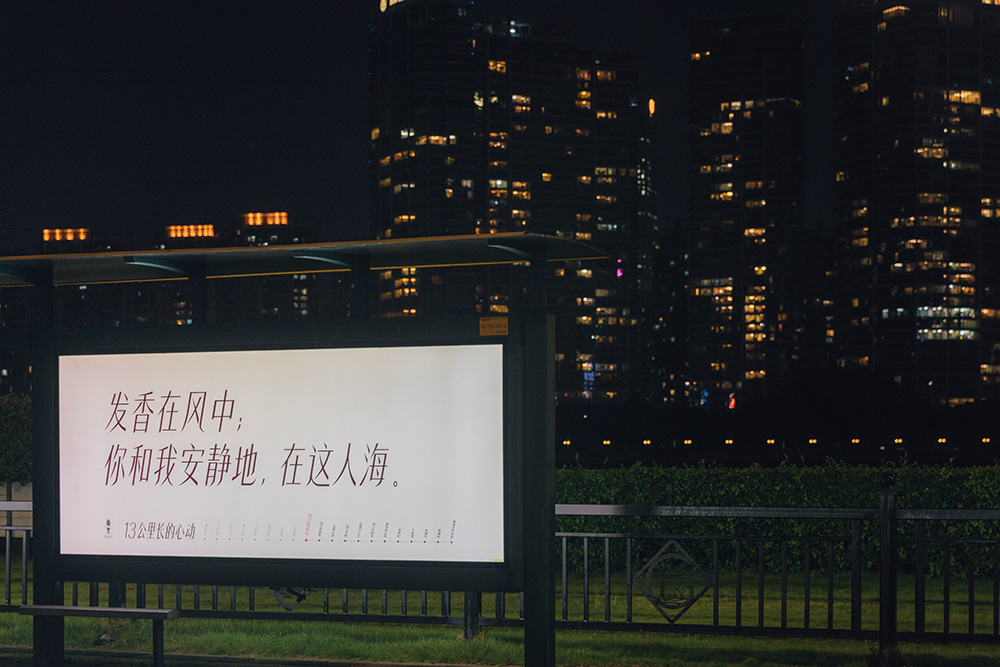 影片还原公交车窗的视角,记录了一趟公交车沿途的候车亭。全片没有台词,没有男女主演,只有一站又一站的候车亭特写;20站候车亭上的文字,连起来,完整地讲述了一个故事——表面看是纪录片,其实是“剧情片”。