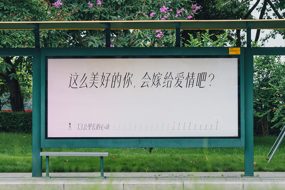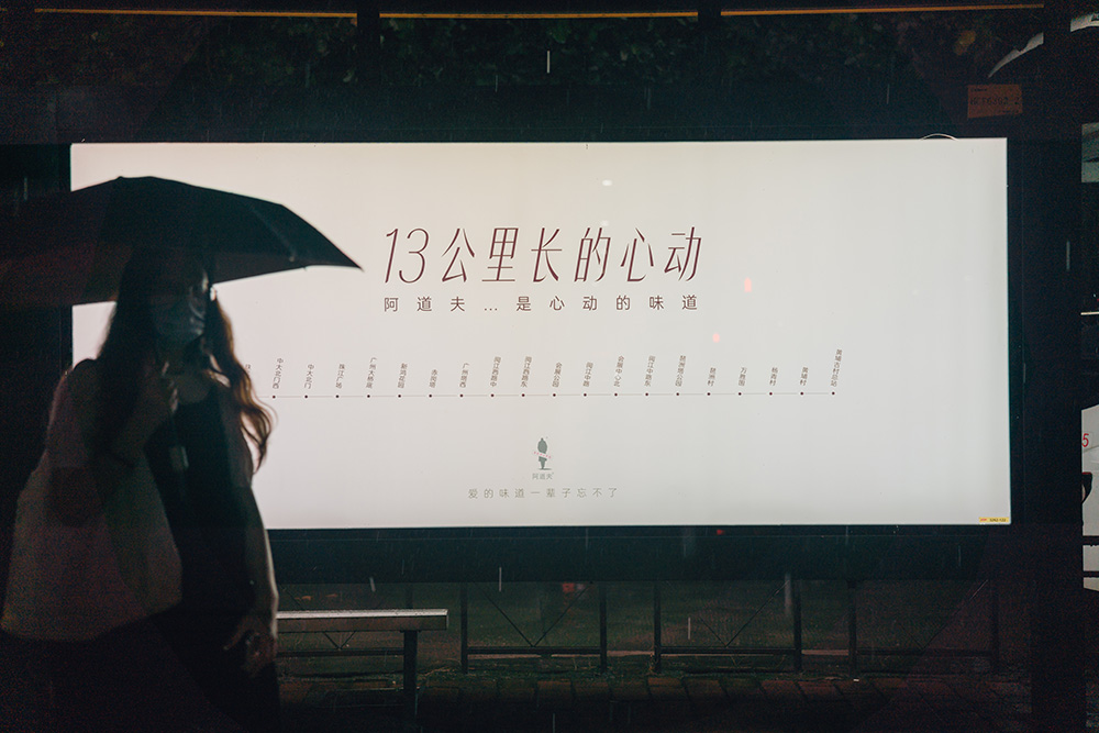 据了解,6月6日起,阿道夫承包了广州“旅游观光1线”全线132块候车亭,打造“13公里长的心动”,将公交站台升级为一道浪漫的风景线,全程13公里,迅速引发了市民街坊的关注。电视媒体报道称,“这个创意让广州增添了一股浪漫气息”。