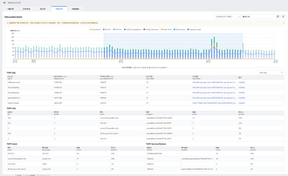 性能问题是数据库运行管理中的痛点,智能诊断助手的多维分析提供了可视化的性能和指标的对比工具,通过直观的性能数据对比,多维度地动态查看和钻取数据库的性能数据。