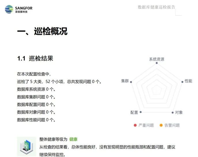 以Oracle数据库为例,巡检包括了系统资源、数据库集群、数据库配置、数据库对象和数据库性能等五个大类,超过50多项的巡检项和算法的支持,全面真实还原了数据库的配置和运行情况,并结合最佳实践和专家经验,在巡检报告中总结和归纳出系统状态和潜在问题,给出一份专业的健康报告。