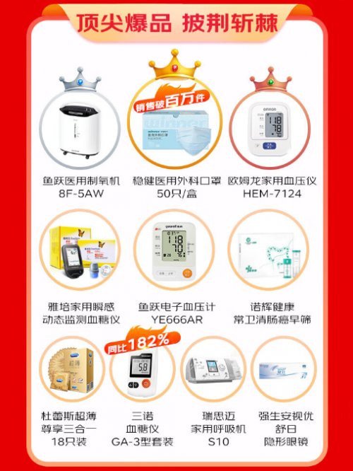 618全时期,心电监测仪品类同比增长8.6倍;京东健康检测自营专区的华为WatchD心电血压记录手表618期间经过数轮补货、仍多次售罄;欧姆龙(OMRON)原装进口电子血压计J710成交额同比增长6.7倍;大包装长周期血糖检测设备增长突出,雅培瞬感动态血糖仪8枚以上装套装产品成交额同比增长266%;瑞思迈 Resmed家用呼吸机销量同比增长317%。
