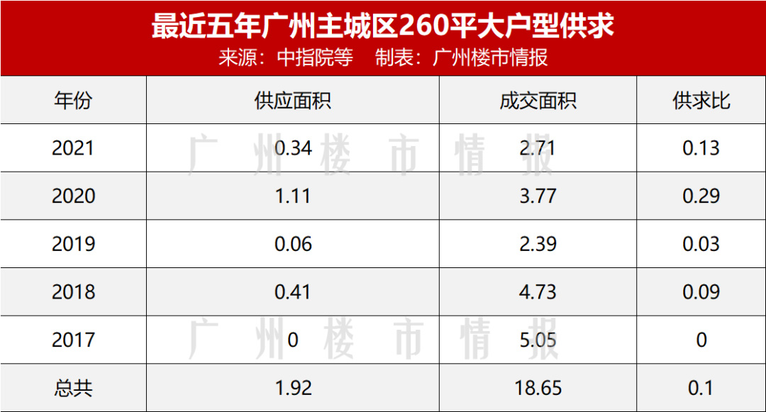 据中指院统计数据,过去五年(即2017-2021年)天河区260平以上大户型产品,总共供应面积约1.92万㎡,成交面积为18.65万㎡,供求比仅0.1。