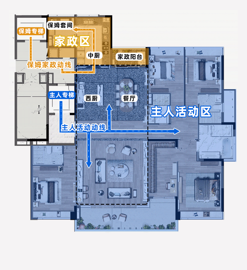 例如梯户比,三梯两户,这里容易有疑问,专梯入户之外,为何多了一梯?这就涉及动线设计:这是给保姆留的工人电梯。而且保姆房有自己单独的出行动线,和主人活动动线不相干。
