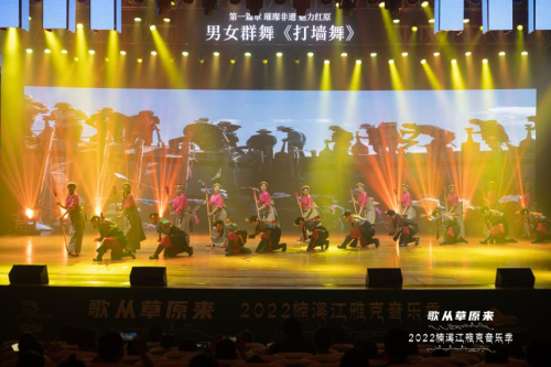 草原的长调空灵而起,藏族歌手们伴着一头牦牛出现在观众视野,整场演出活动在一首《吉祥福箭》的歌声中正式拉开序幕,传统羌族群舞《鼓舞新时代》、藏族非遗舞蹈《打墙舞》、藏族歌曲《吉祥酒歌》、《欢聚一堂》,展现了悠远神秘的雪域高原,多姿多彩的藏羌族文化,热情的歌舞一下子就点燃了现场氛围。