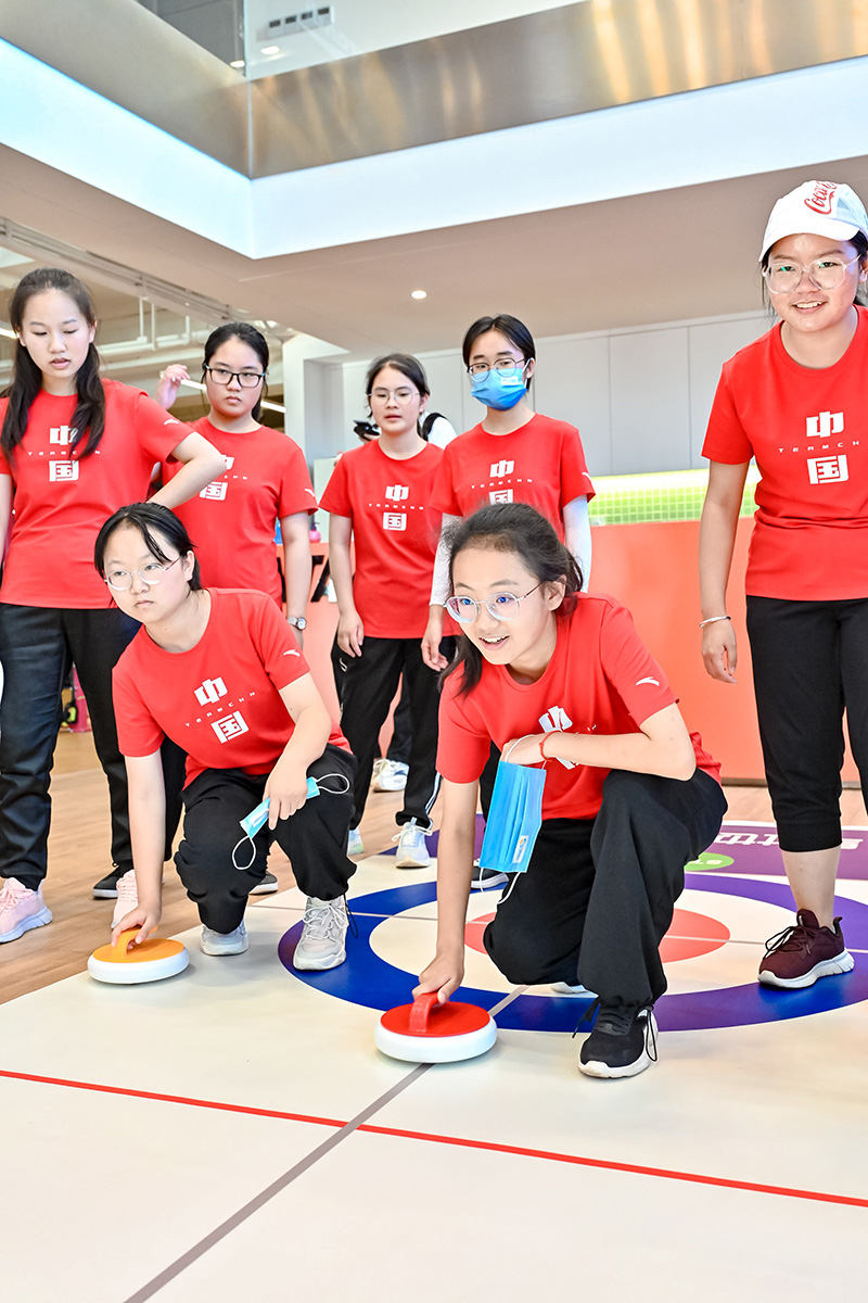 图:学生们体验旱地冰壶项目