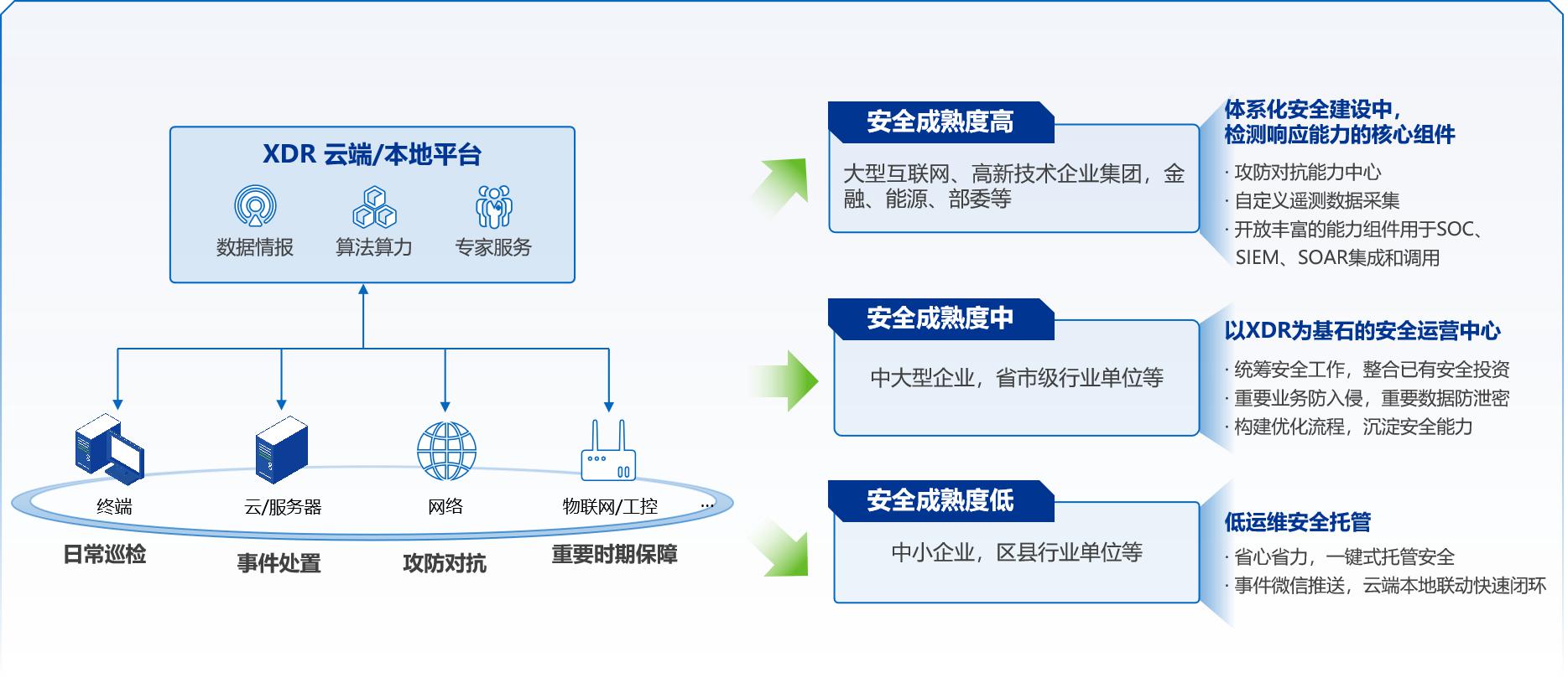 对于安全建设水平高较高的企业,如中大型企业、省市级大数据局等,可以通过XDR方案构建轻量化的安全运营中心,实现对用户关键业务的风险持续监控、威胁深度检测、事件的精准研判和响应处置。