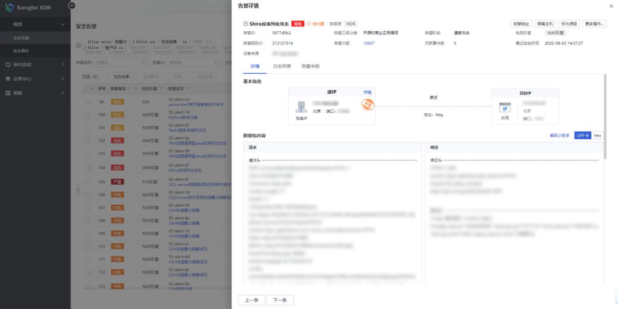 8月3日,深信服XDR检测出红队通过Shiro反序列化漏洞攻击某央企集团演示大屏系统。该漏洞使用加密流量传输,若攻击成功,将造成服务器失陷。MSS专属服务经理果断推送事件,用户立即下线系统进行整改。深信服XDR精准识别漏洞风险与高效应急响应的能力已深入人心。