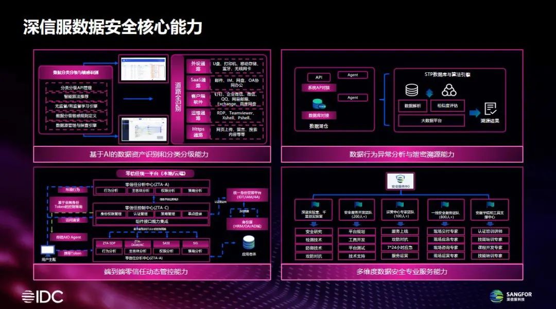 郑磊介绍到,在数据安全建设中,技术能力对于防护效果的提升至关重要。目前,深信服从多方面构建了数据安全的核心技术能力——