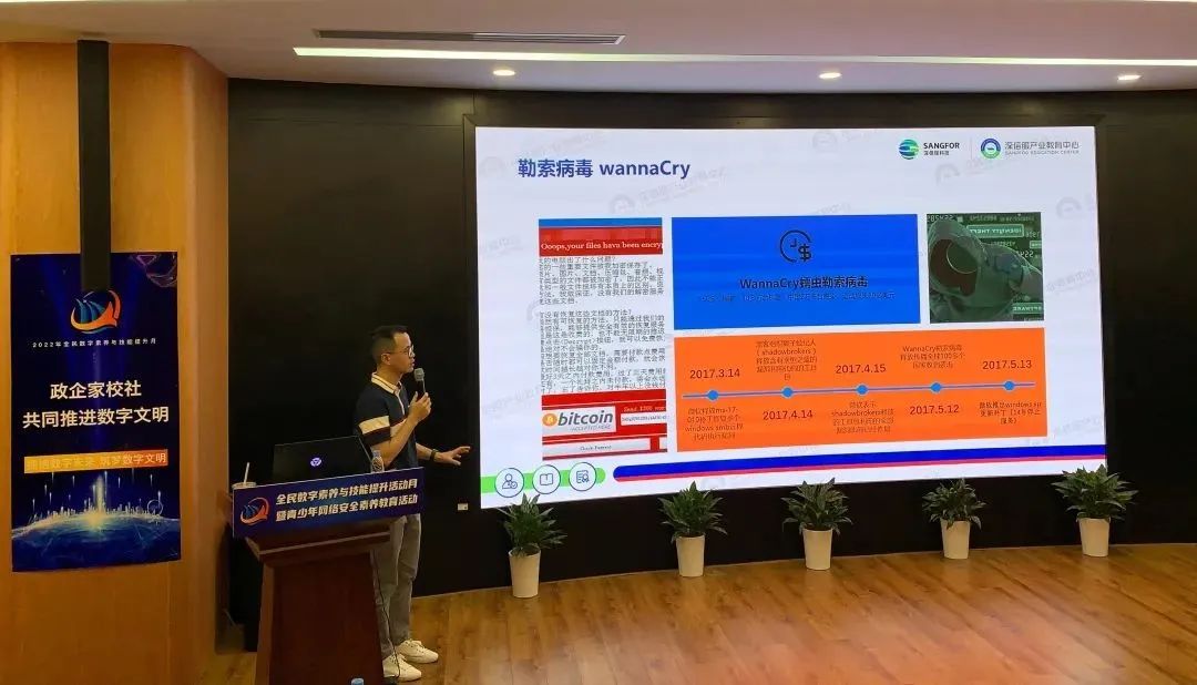 本次活动以提升数字素养、网络安全素养,共同推进数字文明为核心,以数字议题为纽带,以学生为主体,专家(博士)为主导,用适合中小学生的互动方式开展。深信服教学教研中心主任严波在数字素养分论坛:“政企家校社”推进数字文明,做“网络安全攻防演示”主题分享。