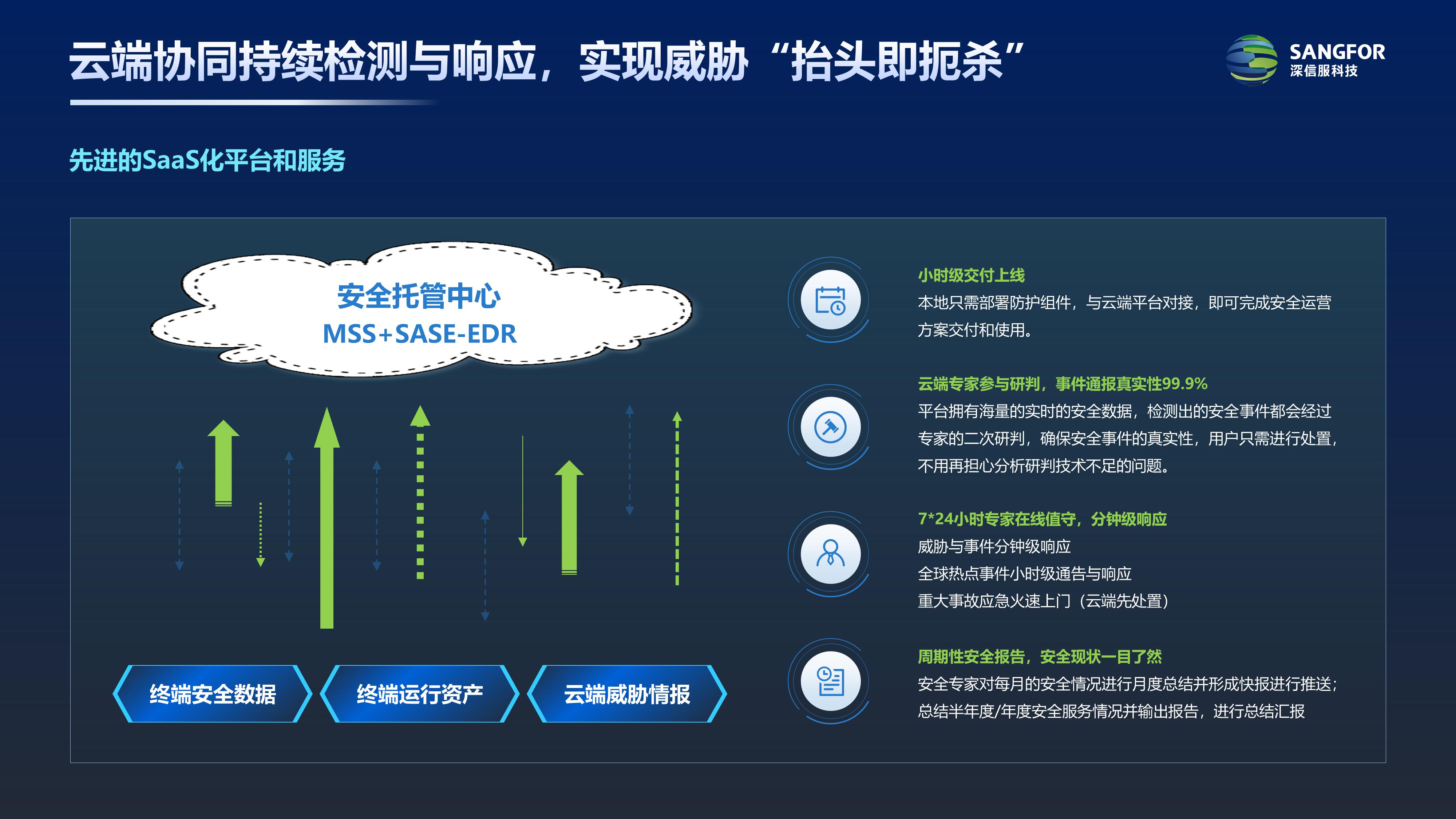 同时,SASE-EDR具备勒索诱捕、微隔离、轻补丁漏洞免疫、RDP爆破防护,二次登陆防护等功能,可实现4-5-6多层次立体防御。勒索事件一旦发生,持续在线的深信服云端专家将在5分钟内快速响应,1小时内遏制事件,从而将事件扼杀在“萌芽”状态,大大降低事件影响。由于勒索病毒极易横向扩散,通过EDR等产品快速联动,一键隔离组织感染终端进行快速遏制,并通过线上线下专家配合协助用户精准溯源排查,彻底根除勒索病毒,全面减少用户损失。