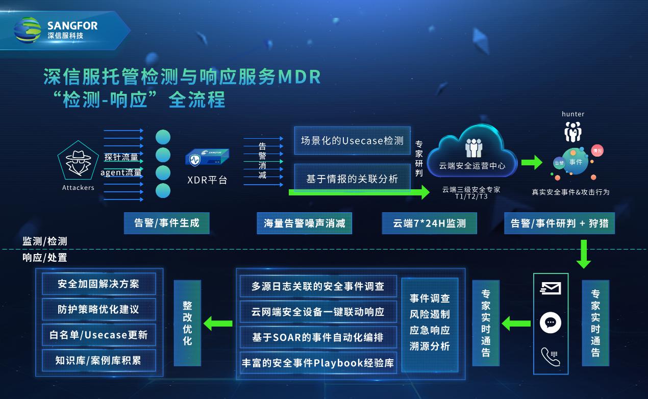 基于多年积累下先进的云端安全运营中心能力和技术、200+云端安全专家团队和覆盖全国的本地应急团队,深信服不断革新服务平台、流程、技术,以“人机共智”为手段,通过 “线上线下协作”的形式为全国上千家用户提供 7*24 小时、持续有效的威胁检测和响应服务MDR。