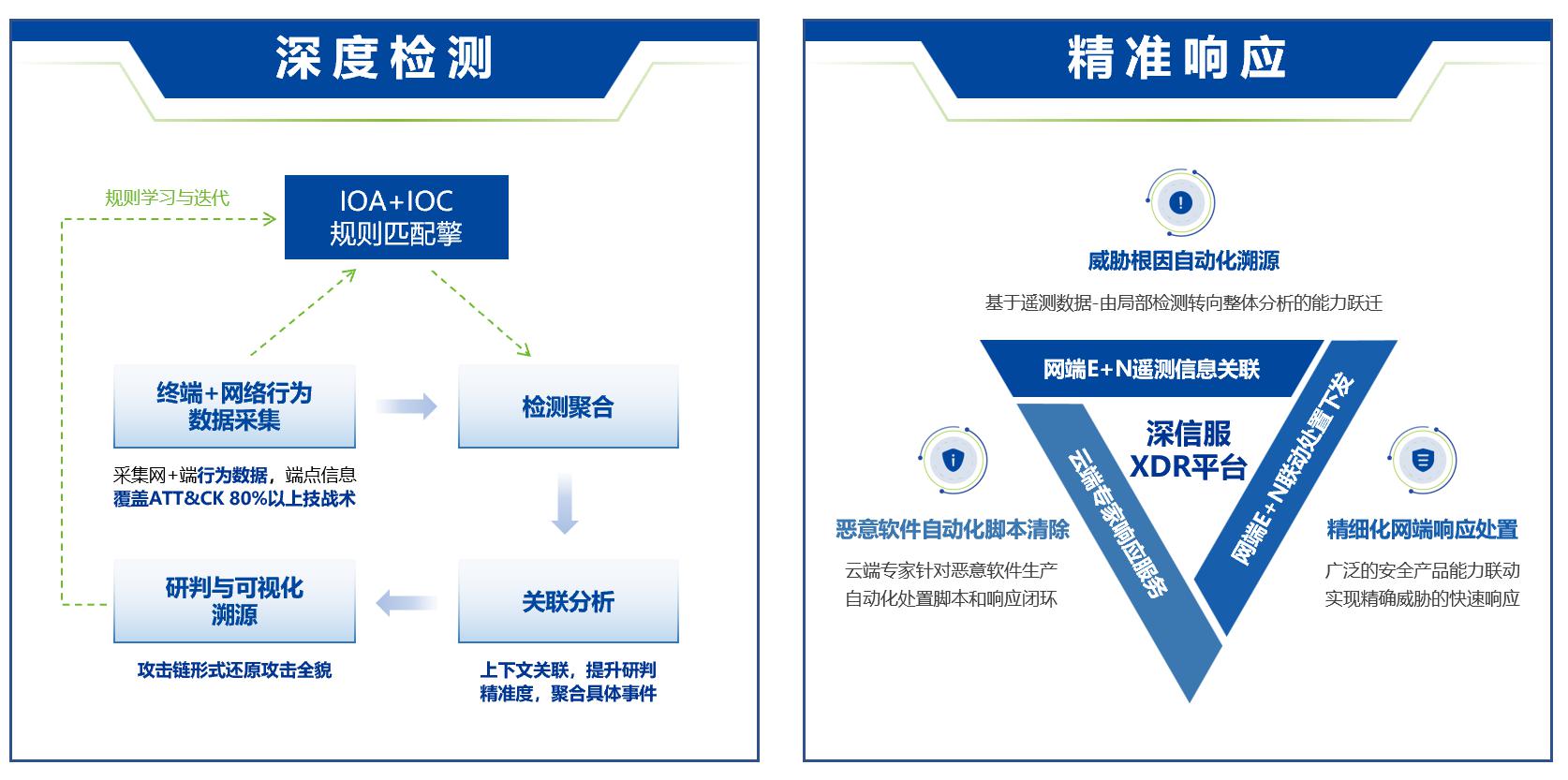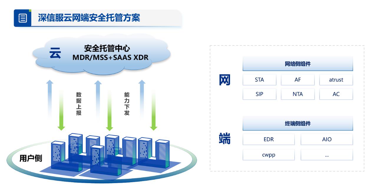 多年深耕,深信服率先“破局”——整合设备、平台、专家的能力,以“云、网、端”三方联动,在重塑边界、终端安全防护能力的基础上,将网、端的安全日志汇集到可扩展检测响应平台XDR上进行集中检测分析,结合7*24小时在线的安全托管服务MSS,做到“预防、防护、检测、响应、处置”的风险全流程管控。