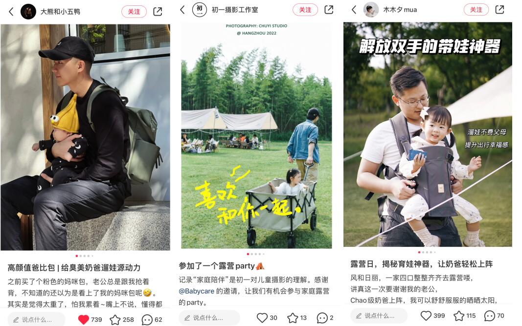 拥抱潮流趋势的风口,Babycare也在积极做出策划和改变。例如,洞察到过去一年露营户外的火热,并结合小红书上的「无性别穿搭」的趋势,Babycare对产品进行新的升级,将妈咪包的功能做成更符合户外场景的设计,并在外形上打造出更加中性风的产品,既适合宝妈,也同样适合宝爸。