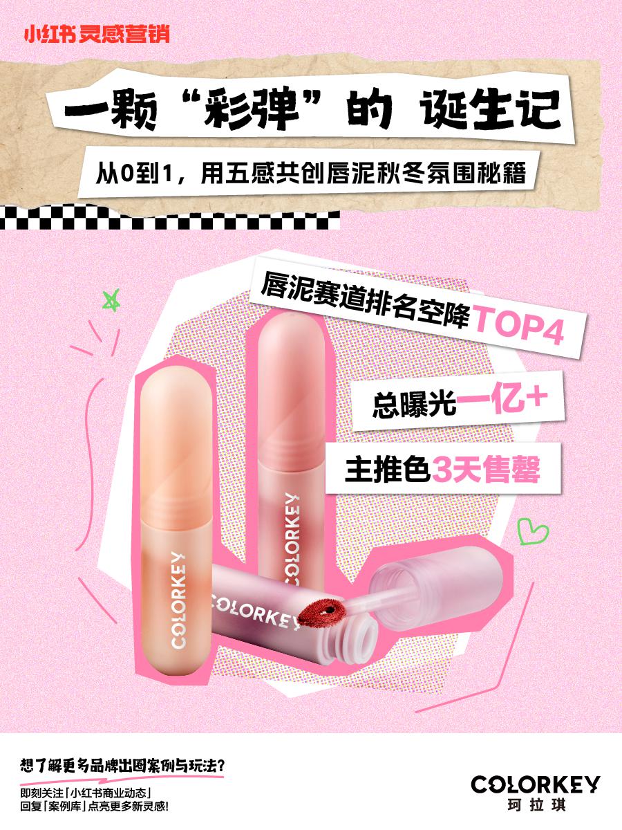 8月,经历3个月的产品打磨与各个部门的配合,Colorkey和小红书灵感营销共创的唇泥正式上线销售,以颠覆性慕斯泥质地、全肤色友好显白的色号,重新定义唇泥产品。