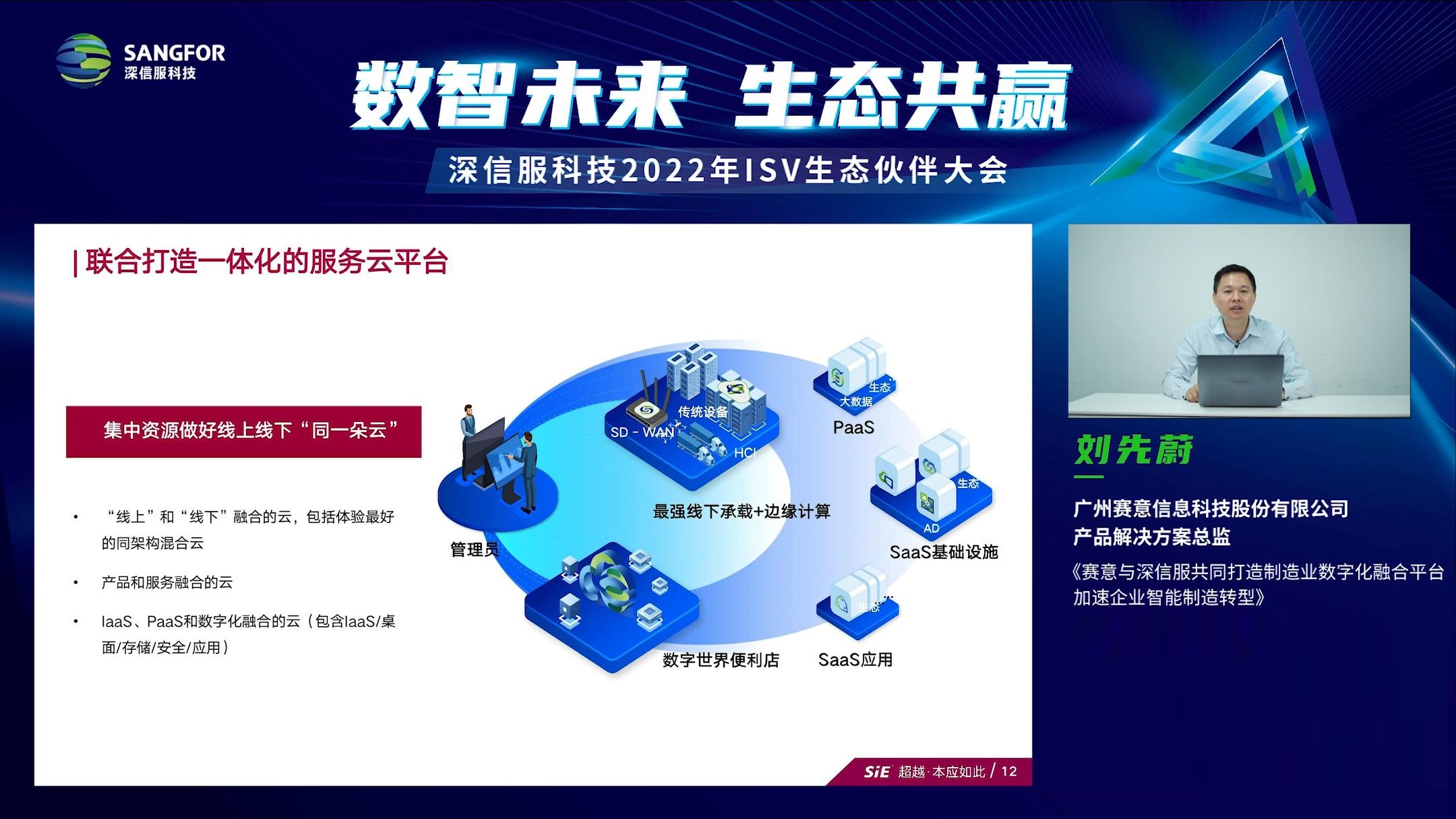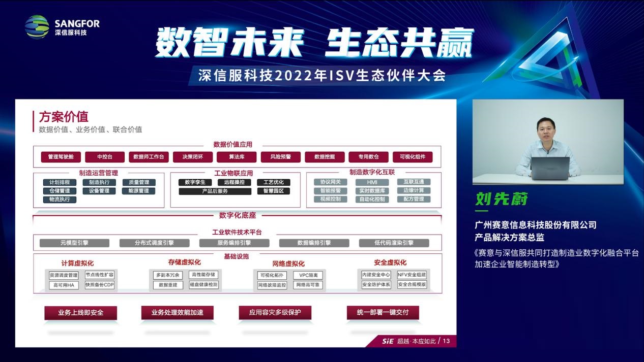 本次大会中,赛意信息产品解决方案总监刘先蔚分享了赛意在自身业务转型过程中,如何通过与深信服建立深度合作,快速补齐自身IT基础设施层面的能力短板,实现业务的创新升级。