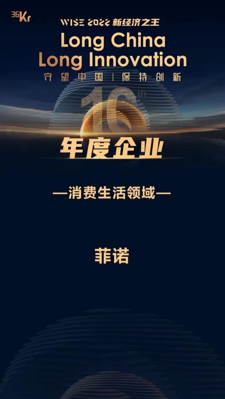 近期,以“Long China Long Innovation,守望中国 保持创新”为主题的第十届36氪WISE2022 新经济之王大会在京、杭举办,邀请众多企业和行业精英一道,共同探讨和见证中国新经济发展之路。值得一提的是,在会议现场重磅发布了“WISE2022 新经济之王”评选结果,菲诺与东方甄选、元气森林等品牌一起获选“WISE2022 新经济之王 消费生活领域年度企业”,这也是2022年菲诺获得的36氪授予的第二份荣誉。