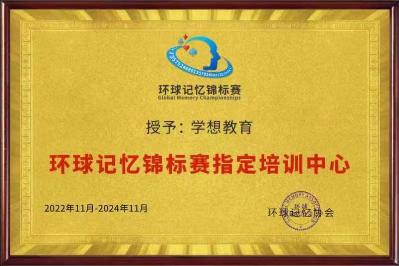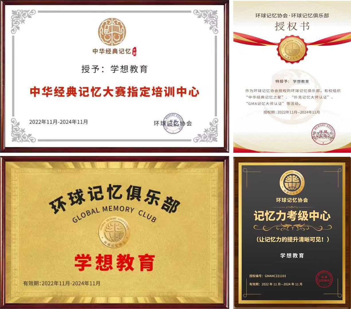 环球记忆协会从创始团队、行业排名、创新能力、教学师资等层面出发,考量到学想教育已在记忆法教育领域取得领先,并具有巨大成长潜力,授予学想教育中华经典记忆大赛指定培训机构、环球记忆锦标赛指定培训机构,并邀请学想成为环球记忆俱乐部中的一员。这标志着学想教育的行业贡献和发展前景,都受到了业内及权威机构的持续认可,彰显了学想教育在教学领域中核心竞争力和领先地位。
