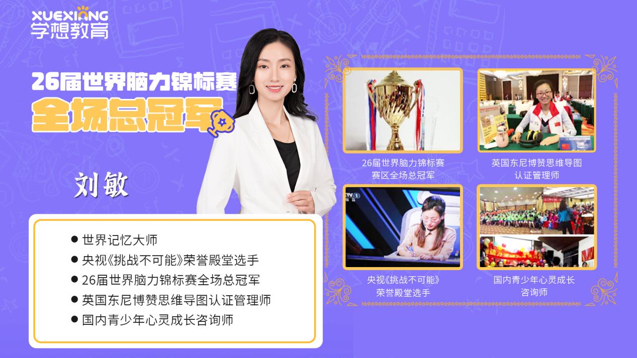 多次参加国际赛事,与来自世界各地的记忆大师交流,她深刻意识到国内记忆方法传播的不足,刘敏老师加入学想教育冠军导师团,希望能通过记忆法训练,让更多孩子能掌握科学有效的方法,学习更轻松。