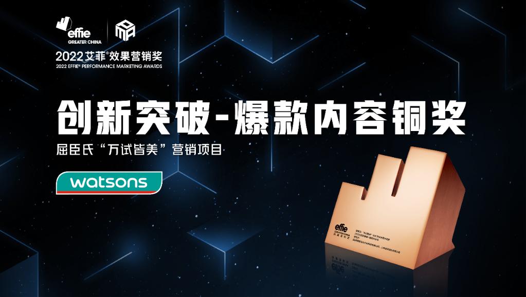 2022艾菲效果营销奖获奖名单揭晓。屈臣氏“万试皆美”营销项目以女性精神价值探讨的创意传播突出重围,斩获“创新突破-爆款内容类”铜奖。此次,屈臣氏深入剖析女性的“完美”焦虑,以“万试皆美”为主题,鼓励女性体验在尝试中与美好不期而遇的过程,并借助创意营销传递以“试”拓展“美”的边界的品牌理念。