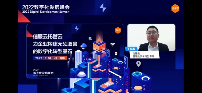 12月28日,由创业邦举办的2022数字化发展峰会通过线上直播形式举办。信服云首席数字化转型专家于佳鳌受邀出席峰会,并进行《信服云托管云为企业构建无须取舍的数字化底座》的主题分享,剖析了企业在数字化转型过程中面临的不想转、不会转和不敢转等问题,分享了信服云托管云帮助企业破解数字化转型难题的实践经验。