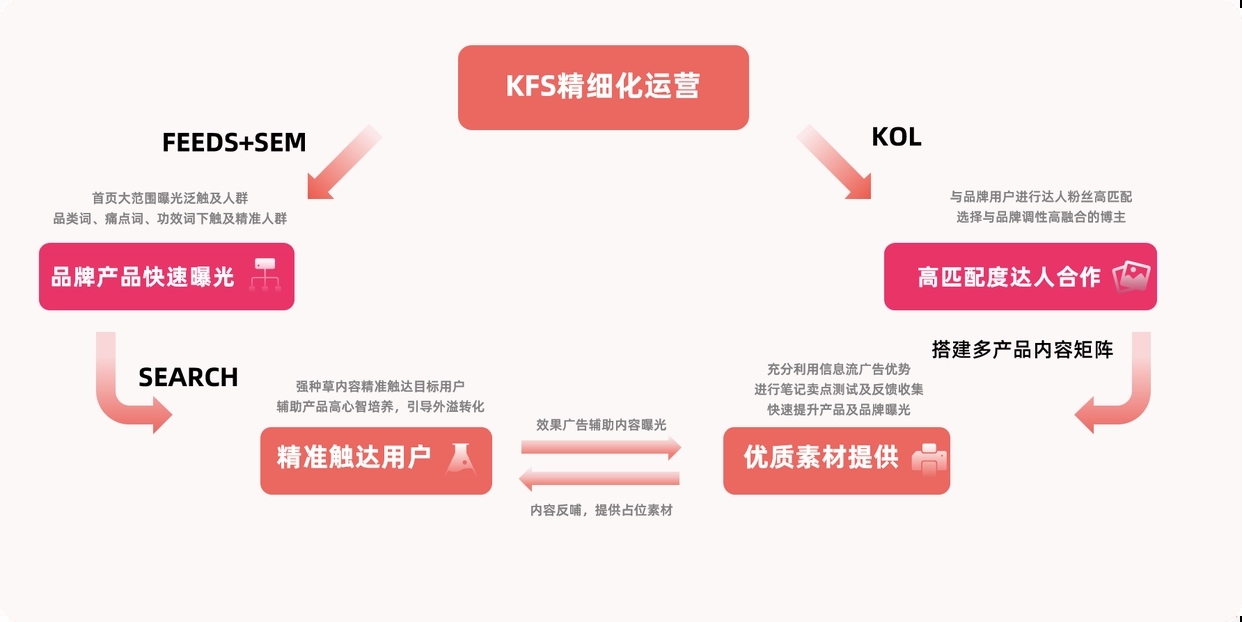 所谓KFS是指,Kol(达人博主)根据产品特性发布具有高价值的种草笔记,构建品牌/产品内容输出的完整布局;Feeds(信息流广告)则通过快速低成本的方式精准触达人群,最大规划化抢占用户心智,完成不同群体的声量渗透;Search(搜索广告)便通过关键词搜索卡位完成赛道抢占,直接引导用户决策。