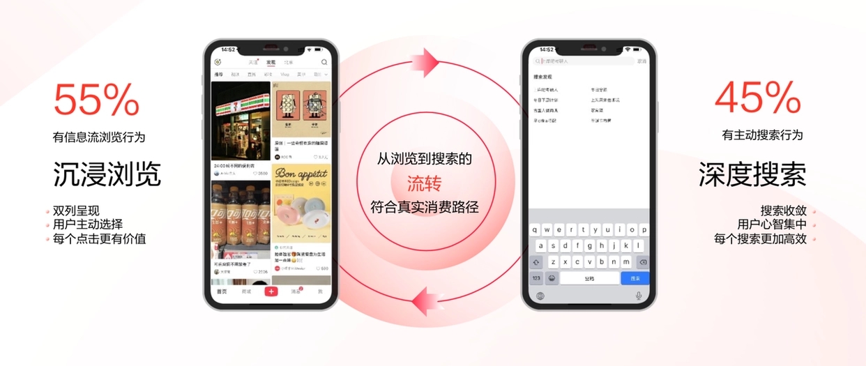 小红书作为年轻人的生活百科全书,社区内有趣、有用的全生活场景内容在持续输出,「百亿次的笔记日均曝光」后续也会继续增长。小红书也发现,站内55%的用户有信息流浏览行为,沉浸式感受推荐种草,另有45%的用户则会主动进行深度搜索。