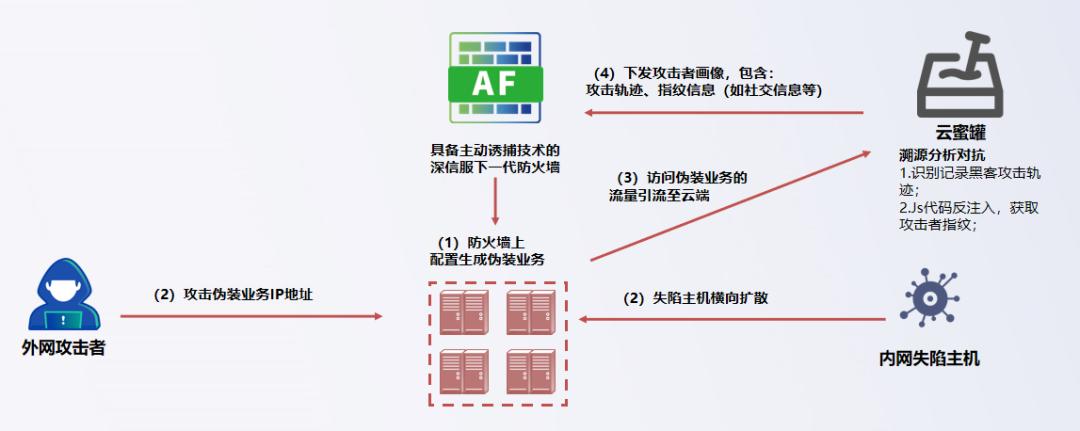 深信服AF将防火墙的检测防护能力与蜜罐的诱捕溯源能力充分联动,不但能诱捕到黑客访问虚拟业务的行为,还能将黑客对真实业务的攻击引流至云蜜罐进行溯源,大幅提升诱捕成功率和攻击对抗能力,通过全面、精准的溯源反制,缩短威胁处置时间,最终在实战攻防中占据先机。