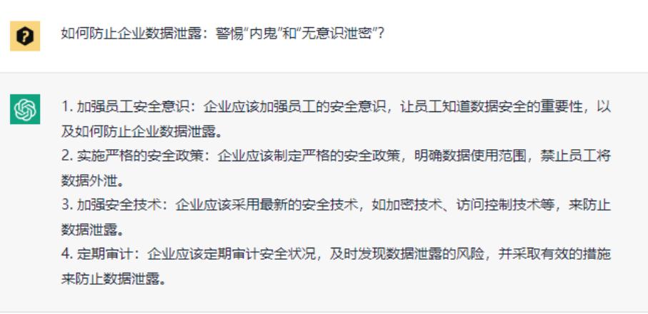 抱着试一试的心态,小编就企业防数据泄密问题向它发起提问,来看看它是怎么解答的: