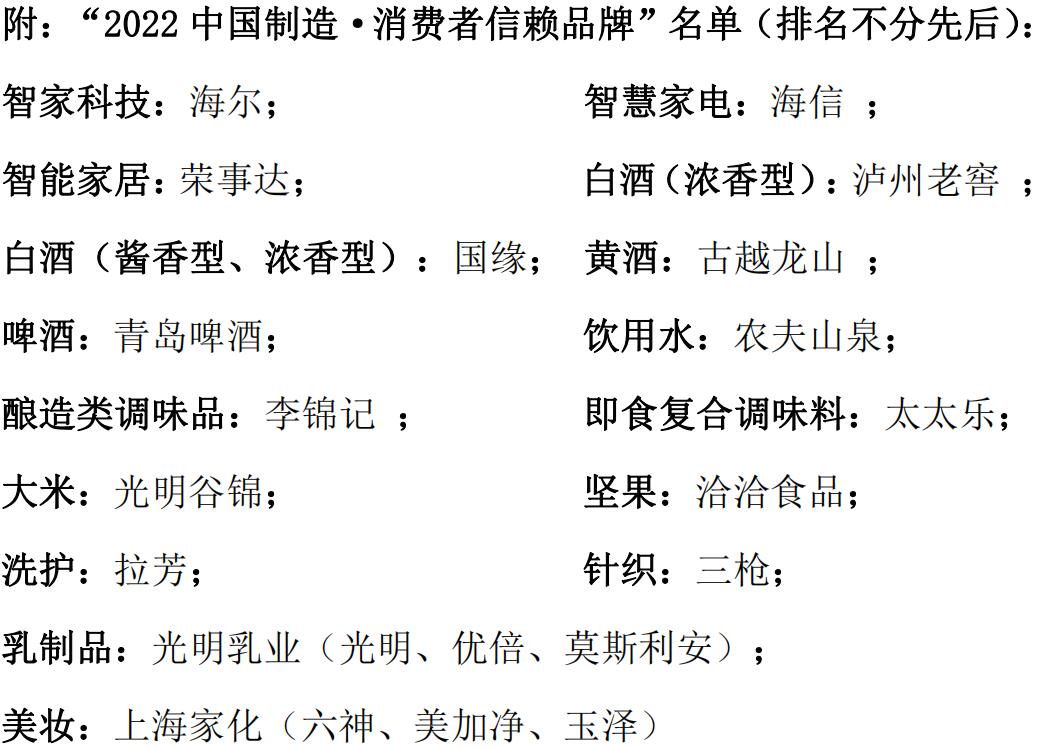 “2022中国制造·消费者信赖品牌”企业名单公示