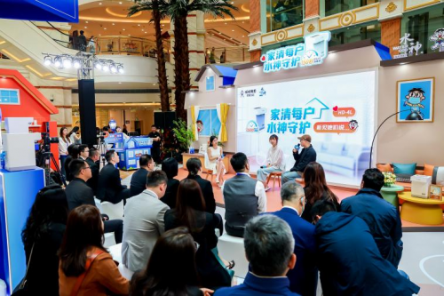 契合发布会主题,旺旺水神现场模拟家居环境,以新品水神HD-4L消毒机为中心,连接客厅、卧室、厨房、餐厅、卫浴等日常环境,用水神替代自来水使用,演示客厅地面清洁、卧室家纺打理、厨房蔬果清洗、卫浴系统除味、全屋降甲醛等,全场景展现水神HD-4L消毒机的家庭应用场景。