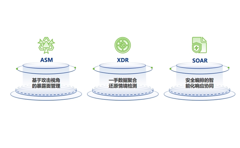 ASM基于攻击视角管理资产暴露面,能够对资产脆弱性进行优先级分析,使资产看得清,应急有先后;XDR通过网端一手数据采集,结合网端聚合分析引擎,实现攻击链深度溯源,检测能力更全面,事件响应更精准;SOAR通过安全编排的智能化响应协同,可实现安全运营的标准化、自动化、智能化。