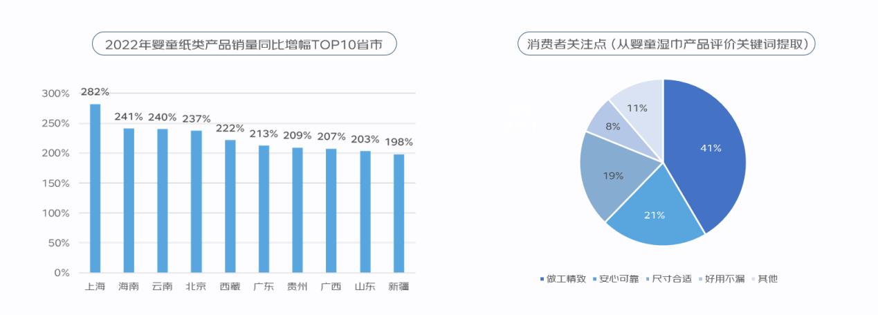 以婴童湿巾为例,消费者更关注产品的“做工”、“安全性”、“实用性”,力求为家中宝宝提供更舒适的体验,从2022年婴童纸类产品销量同比增幅TOP10省市来看,上海、海南、云南、北京、西藏等地消费者在线上选购了更多婴童纸品。