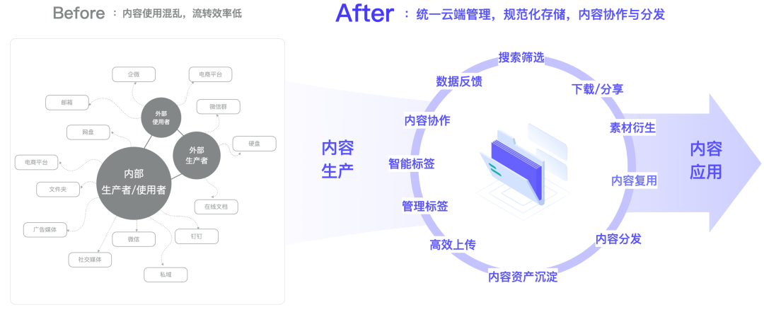然而市面上大多数 DAM 平台,主要解决的仅仅是存储和传输的问题,并不能对营销内容素材进行有效地管理和复用,奥创的 DAM 平台则主要帮助用户实现素材在跨部门、跨产品线、跨媒体的素材综合管理与共享。
