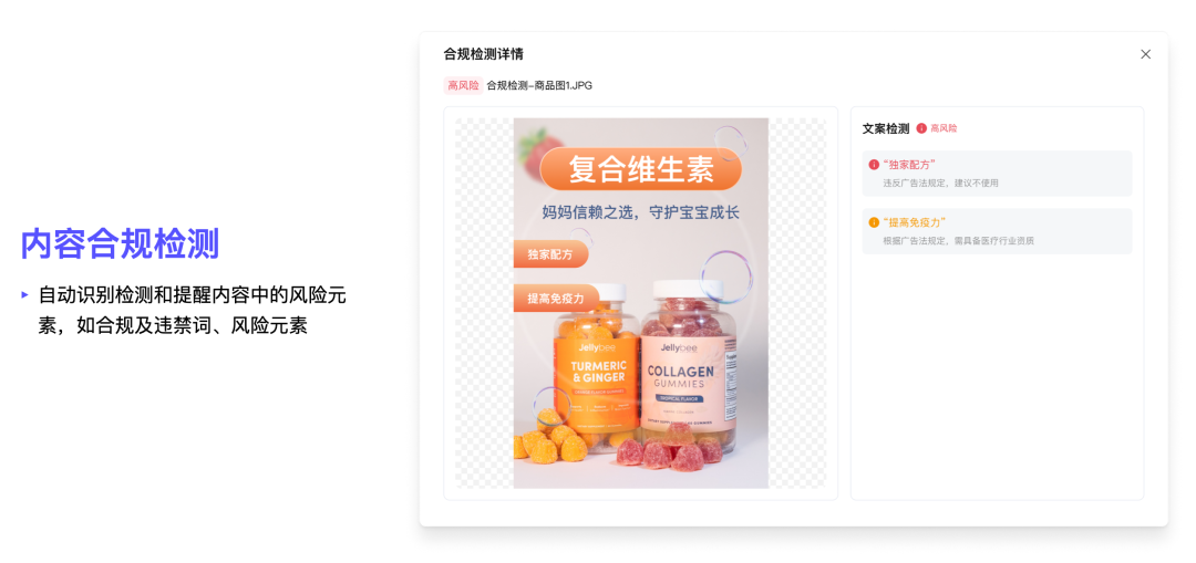 在安全性方面, DAM 还可以充当内容审核员,对品牌内容素材进行全方位审查,并提示内容潜在风险,如违规词、违规画面和素材版权等问题。