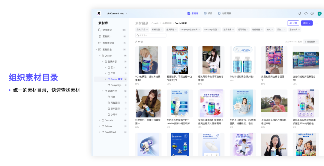 奥创光年 DAM 支持品牌客户在标签体系的基础上自建素材目录,自由分类、打包和分享素材,除此之外, DAM 还提供多维筛选器和搜索功能,帮助企业营销团队成员轻松精准找到目标素材。