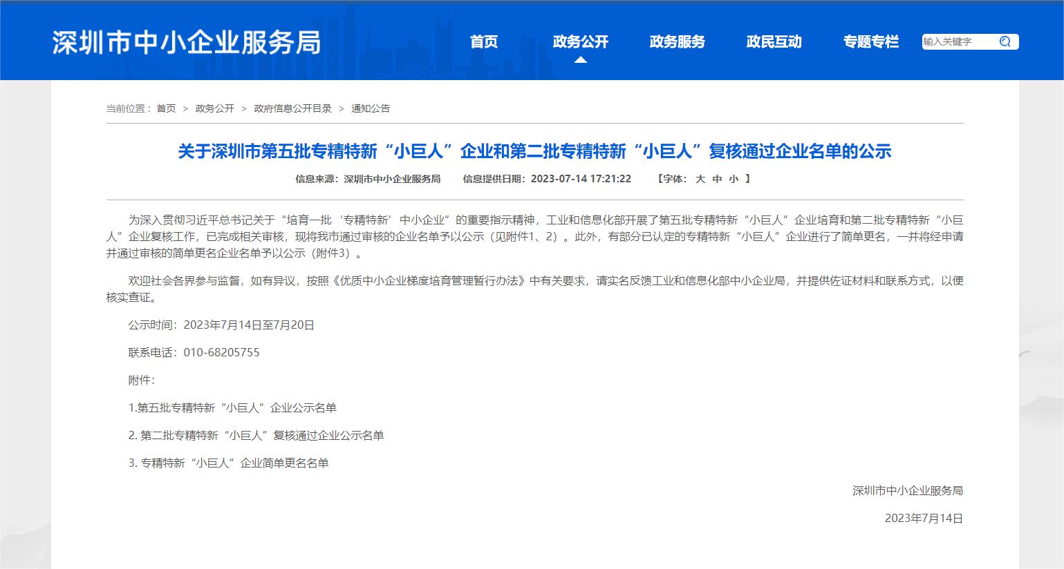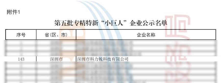 2023年7月14日深圳市中小企业服务局发布了“关于深圳市第五批专精特新“小巨人”企业和第二批专精特新“小巨人”复核通过企业名单的公示”,深圳市科力锐科技有限公司入选第五批专精特新“小巨人”企业。