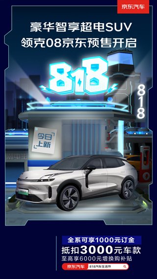 8月8日,818京东汽车生活节开门红当天,领克汽车主推车型-领克08豪华智享超电SUV在京东领克官方旗舰店开始预售。8月8日20:08-9月7日22:00,消费者在领克App、领克小程序等官方渠道订购领克08可享预订膨胀礼、优先锁单全权、高端进阶礼、时间限量礼、悦享换新礼等多重礼遇。作为领克的新能源战略车型,领克08一经上线便引发行业与消费者高度关注。