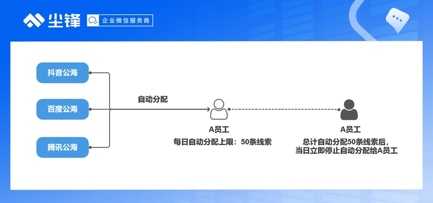 据了解,尘锋SCRM本次上线的公海自动分配功能,可以实现公海与公海、公海与员工私库之间的自动分配流转,既可以实现按规则自动分配,将符合条件的线索从A公海自动转移到B公海,全面高效地将同类线索自动集中到一个公海中,还可以基于企业对员工接待的规则设置,将线索自动分配给员工,同时可限制公海每日自动分配给员工私库的线索数量。