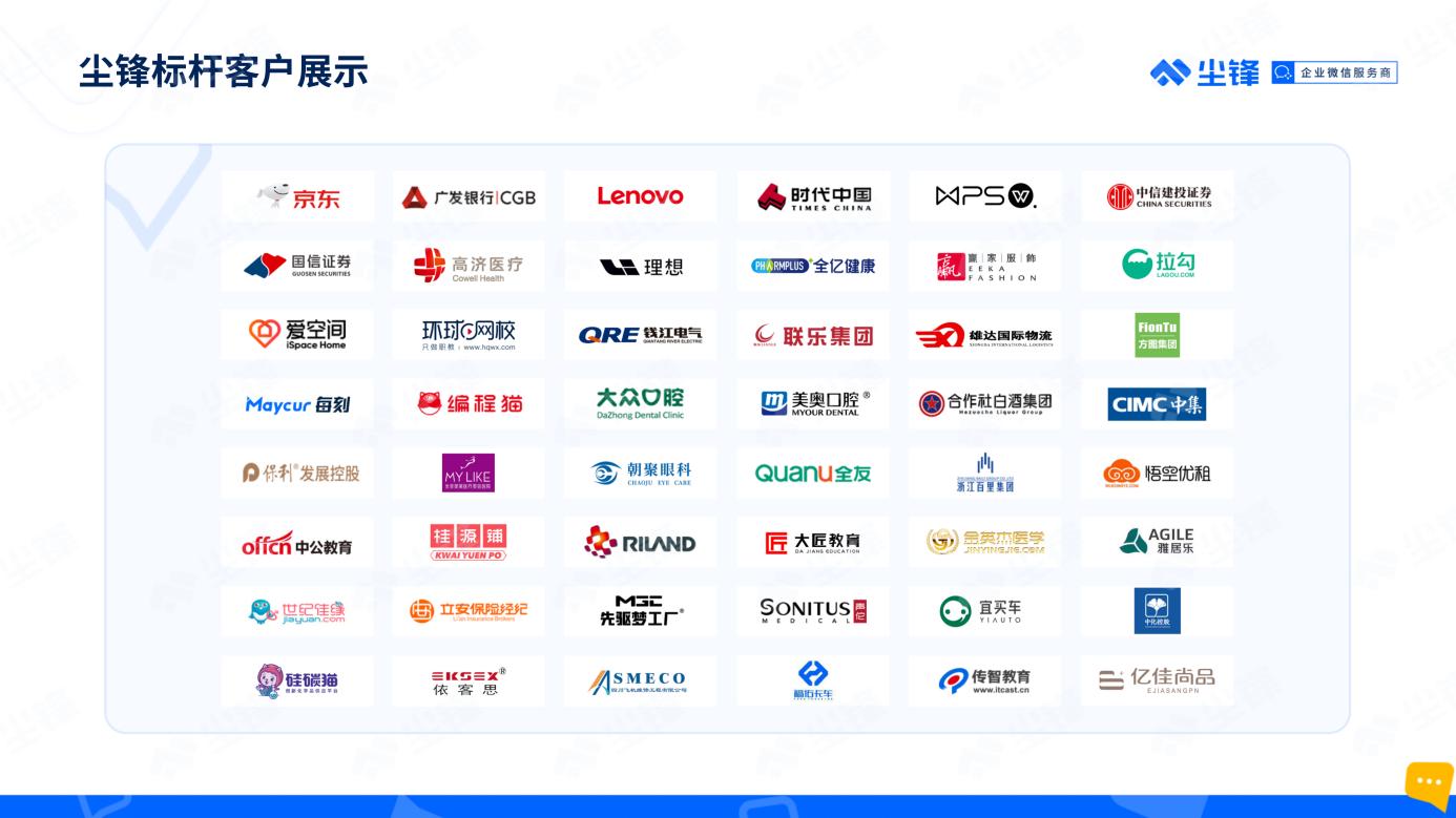 作为SCRM行业领军企业,尘锋时刻关注企业在数字化营销时代的需求与痛点,坚持不断打磨产品功能、迭代服务体系,现已为消费医疗、汽车销售、家装家居、职业教育、金融、房地产等30多个行业、10000多家企业提供专业服务。未来,尘锋将继续依托企业微信生态优势和自身的专业能力,用更加专业优质的产品与服务帮助企业客户升级业务效率,为更多企业客户的增长提供专业助力。