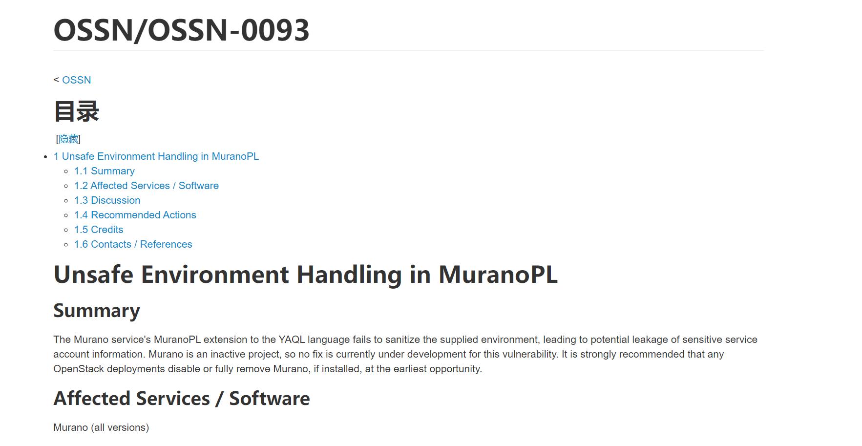 Murano是OpenStack中的一个组件,原本用于提供应用程序商店和部署功能,然而,MuranoPL扩展对YAQL语言的处理存在不安全环境处理的问题。更为严重的是,Murano项目目前已经停止维护,意味着没有官方修复计划来修补这个漏洞。