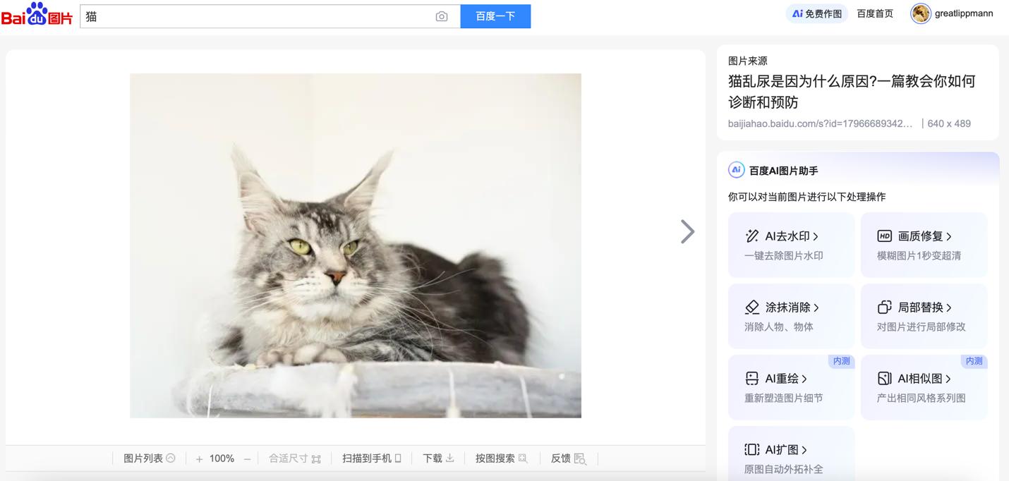 百度搜索的「AI图片助手」,不仅能上传后修图,也支持在线编辑百度中搜到的所有图片。