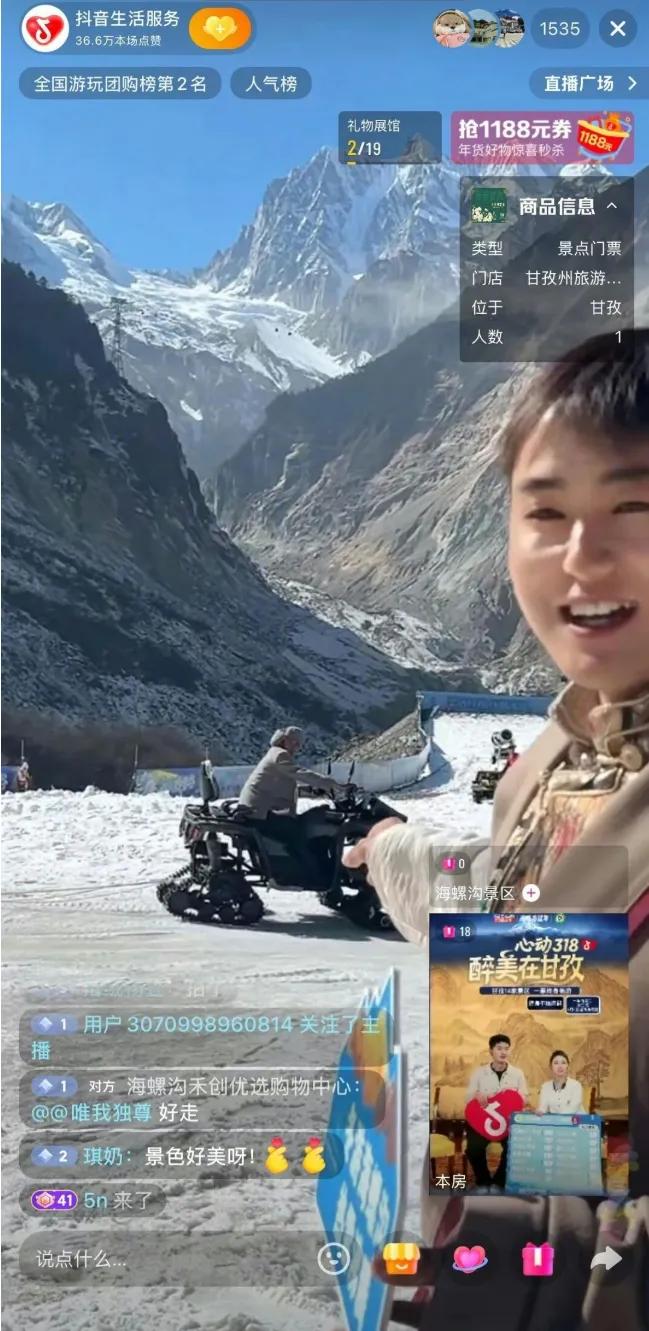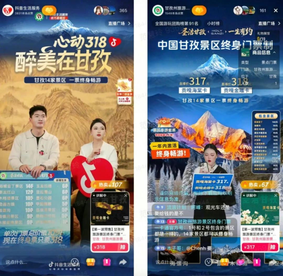 而若复盘甘孜州文旅1月28日堪称疯狂的直播,会发现这次景区终身门票首发销售采取了双官方号配置。