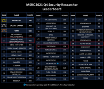 深信服研究人员以第二名的佳绩荣登微软2021年度Q4季度“Windows安全研究员榜”